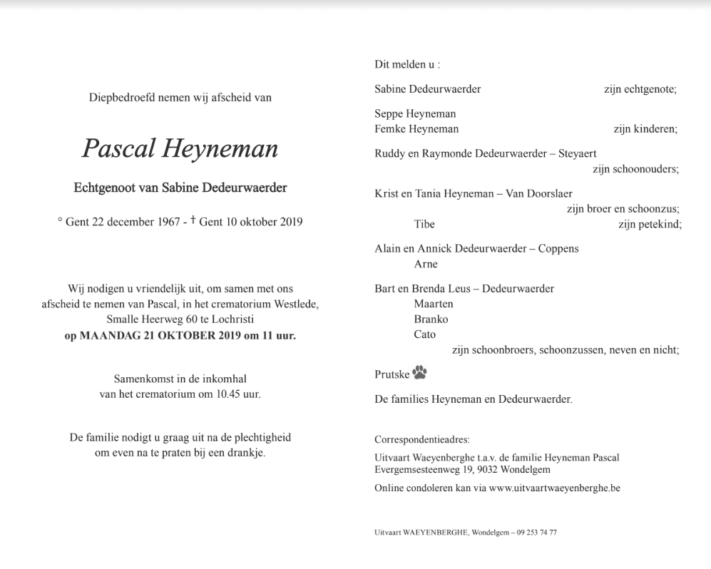 Op maandag 21 oktober nemen we afscheid van Pascal. Iedereen wordt hierbij uitgenodigd om aanwezig te zijn.