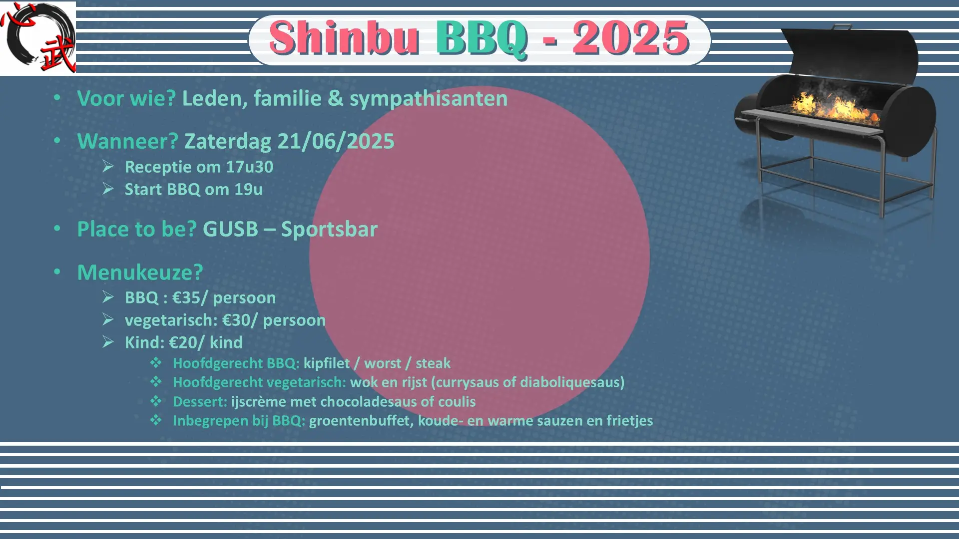 Universitair Sportcentrum (Gent) Watersportlaan 3, Gent, Oost-Vlaanderen, BelgiëThe end of season is near! Het einde van het Shinbu-seizoen komt steeds meer dichterbij…en zoals voorgaande jaren willen we het seizoen afsluiten in stijl!Zaterdag 21/06/2025 organiseert Shinbu een BBQ om samen met jou, familie & vrienden,… het einde van het seizoen te vieren en de nakende zomervakantie in te zetten!Samen gezellig met elkaar kunnen […]