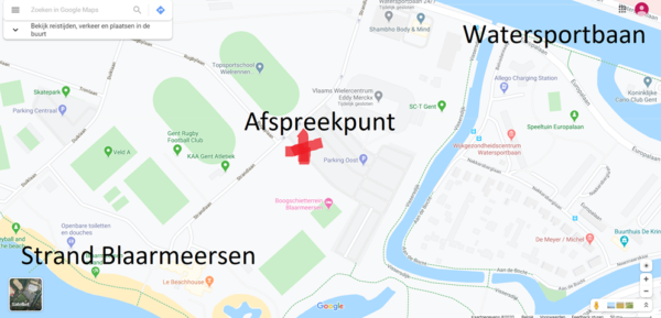 • We spreken af op een gezamenlijk punt, nl. de parking van het Vlaams Wielercentrum Eddy Merckx (Strandlaan 3 – 9000 Gent) in de blaarmeersen (zie ook afbeelding onderaan) om 18u50 (dinsdag) en 19u20 (donderdag).