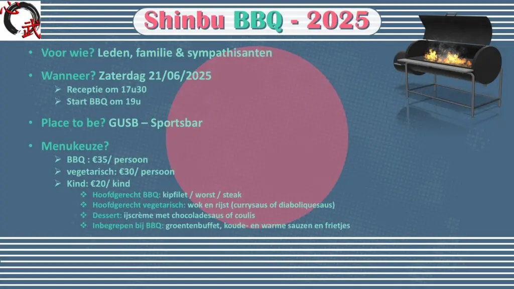 Zaterdag 21/06/2025 organiseert Shinbu een BBQ om samen met jou, familie & vrienden,… het einde van het seizoen te vieren en de nakende zomervakantie in te zetten!